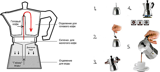 Конструкция созданной Альфонсо Биалетти кофеварки действительно сходна с этим агрегатом. Гейзерная кофеварка Moka состоит из трех камер: нижняя содержит воду, средняя — молотый кофе, верхняя предназначена для готового кофе. При нагревании в нижней камере образуется пар, его давление выталкивает воду по трубе вверх в полость, заполненную кофейным порошком. Оттуда по еще одной трубе готовый кофе попадает в верхний резервуар. Кажется, просто донельзя. Но для 1930-х годов это было настоящее открытие. С помощью такой кофеварки можно было легко сделать дома крепкий, как в кофейне, эспрессо с таким же насыщенным вкусом. До Биалетти этого не удавалось достичь никому.