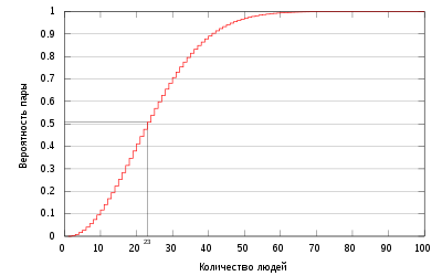 В группе, состоящей из 23 или более человек, вероятность совпадения дней рождения (число и месяц) хотя бы у двух людей превышает 50% — интересно не правда ли?