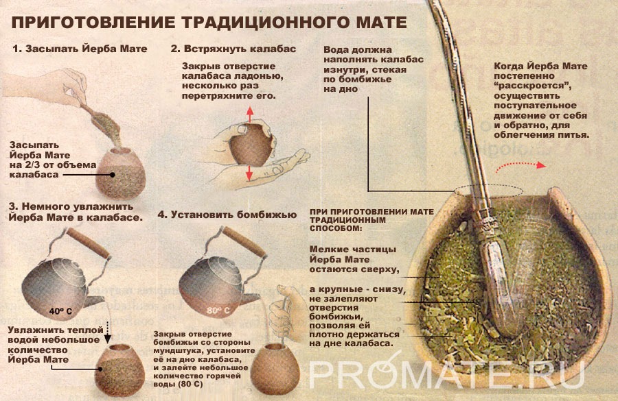 Заваривается очень крепко в калебасах, но можно заваривать и в обычном чайнике или чашке. Заварку заливают горячей (до 80 градусов) водой и настаивают 2-3 минуты. Можно заваривать до 7-8 раз. Подробное описание на картинке ниже.