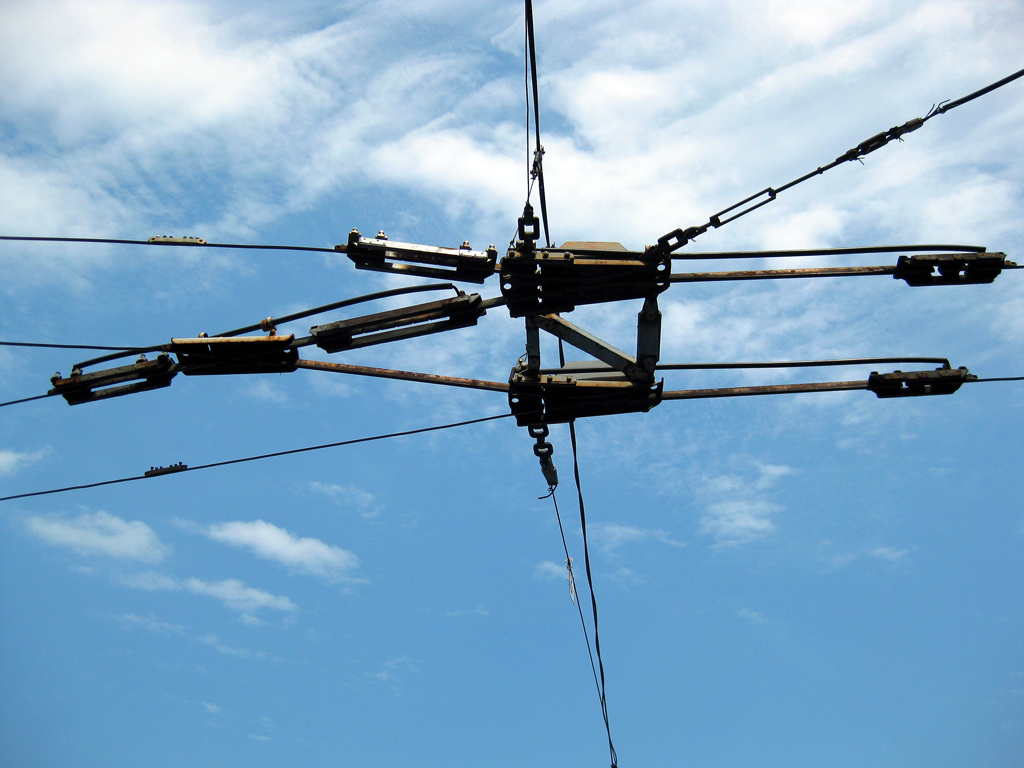 Ах да, и правое направление обесточено, дабы избежать короткого замыкания пересекающихся проводов. Так что если троллейбус остановится, когда его штанга будет находиться на изолированном участке (обычно длиной метра полтора-два на правых проводах стрелки) — то его останется только толкать.