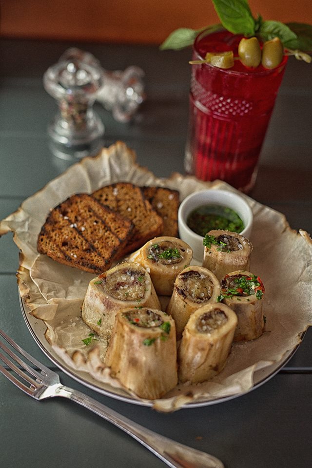 Мозговые кости (они продаются уже распиленными, а если нет — попросите это сделать) уложите на противень, выстланный фольгой, широкой стороной книзу и запекайте 15-20 минут при температуре 220 градусов: костный мозг должен размягчиться, но не расплавиться. Пока мозг готовится, сделайте салат — всего-то и нужно, что мелко нарезать зелень петрушки, лук и каперсы, а для заправки взбить вилкой до эмульсии горчицу с соком лимона, понемногу добавляя масло. Как следует перемешайте салат и сделайте гренки — багет или ржаной хлеб подойдут одинаково хорошо.