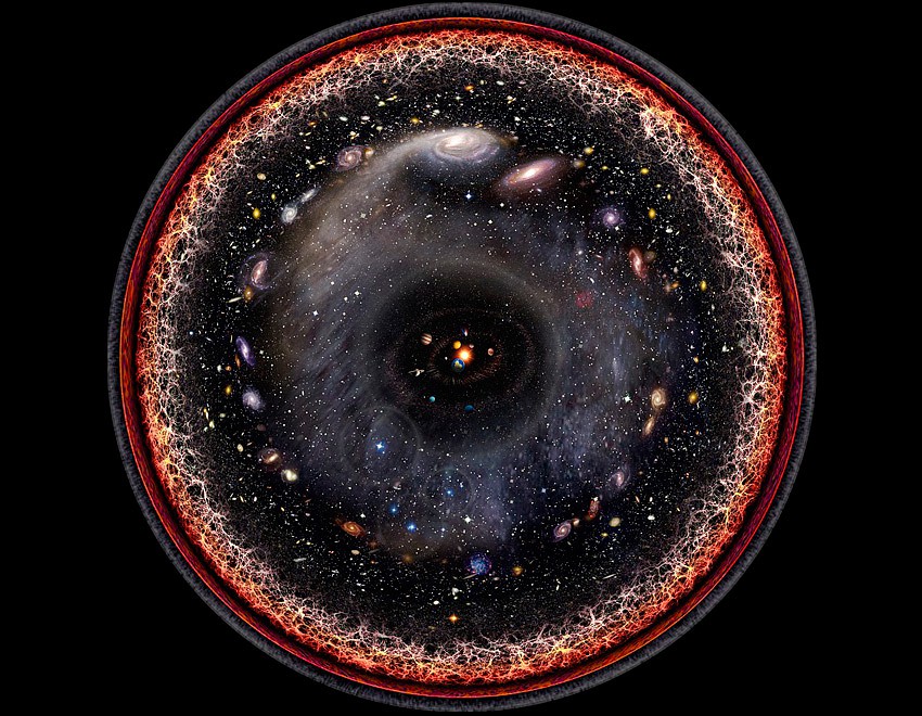А ниже картина Пабло Карлос Будасси, на которой подробно изучив логарифмические карты и спутниковые изображения звездного неба, он изобразил свое представление о Вселенной. На переднем плане отображено все – от Солнца до галактики Андромеды, окруженных облаком плазмы, образовавшегося миллиарды лет назад в результате Большого Взрыва.