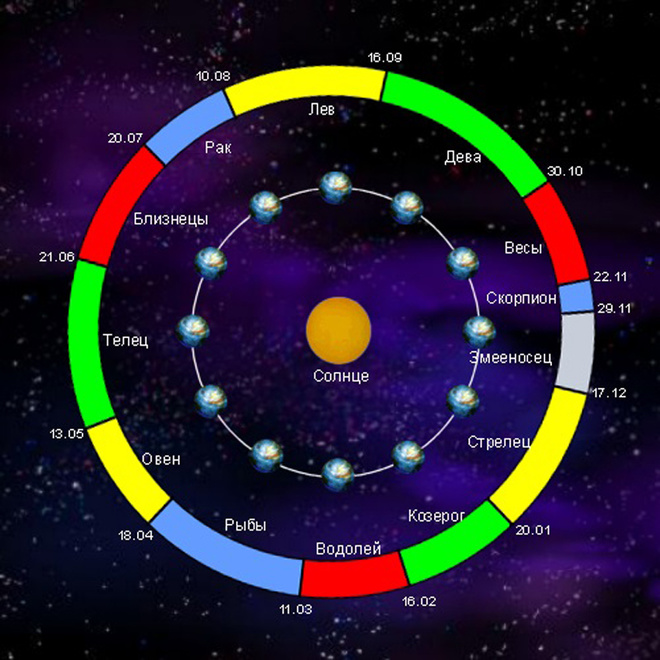 С Земли им казалось, что Солнце крутится вокруг нас — и в древности люди считали, что так оно и есть. На своем пути Солнце проходит перед созвездиями — пояс этих созвездий и называется зодиаком.